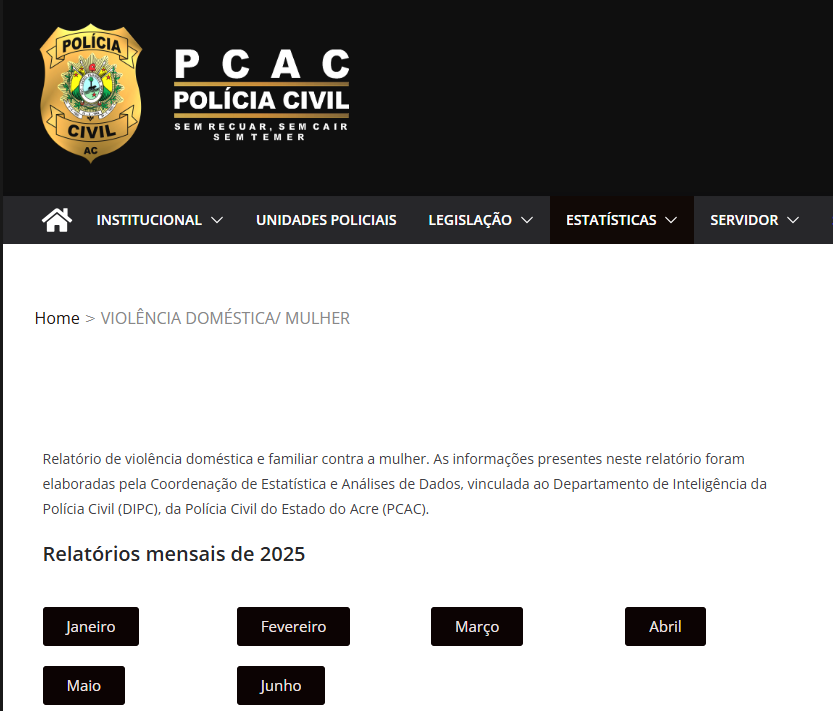 A novidade está disponível no site oficial da Polícia Civil do Acre. Para acessar os relatórios, basta entrar no portal da PCAC, selecionar o menu “Estatísticas”, depois “Relatórios Indicadores” e clicar na aba “Violência Doméstica/Mulher”. Os dados referentes ao período de janeiro a junho deste ano já estão publicados.