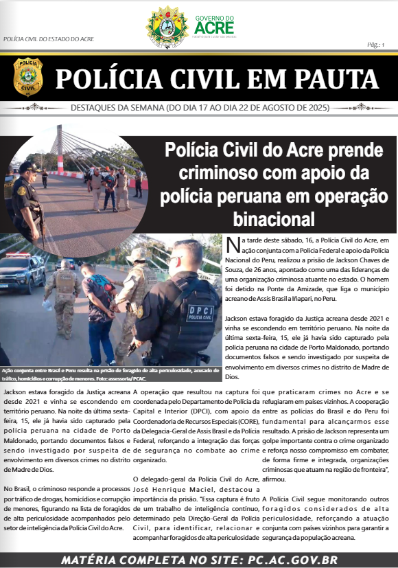 A Polícia Civil do Estado do Acre (PCAC), por meio da Delegacia de Atendimento à Criança e Adolescente Vítima (DECAV), realizou nesta sexta-feira, 10, duas prisões e o cumprimento de um mandado de busca e apreensão relacionados a crimes contra crianças e adolescentes. A Polícia Civil do Acre (PCAC) lança uma série de dicas com o objetivo de conscientizar a população sobre a violência contra a pessoa idosa. A iniciativa busca orientar sobre os diferentes tipos de violência física, psicológica, financeira e negligência, além de reforçar a importância da denúncia e proteção dos direitos da pessoa idosa. A ação integra o compromisso da PCAC em promover uma sociedade mais segura e justa, fortalecendo o respeito e o cuidado com aqueles que tanto contribuíram para o desenvolvimento do nosso Estado. Na tarde da última quinta-feira, 9, a Polícia Civil do Acre (PCAC), por meio da Delegacia de Homicídios e Proteção à Pessoa (DHPP), localizou e prendeu Idenir de Menezes Oliveira, conhecido pelos apelidos “Mandim” ou “Denes”, na parte alta de Rio Branco, na invasão do Cruzeirinho, rua Topázio. A Polícia Civil do Acre (PCAC), por meio da Delegacia-Geral de Marechal Thaumaturgo, com o apoio da Polícia Militar, cumpriu na tarde de quinta-feira, 9, um mandado de busca e apreensão contra um adolescente acusado de integrar uma organização criminosa e praticar furtos no município. A Polícia Civil do Acre (PCAC), por meio da Delegacia-Geral de Rodrigues Alves, deu cumprimento, na manhã desta quinta-feira, 9, a um mandado de prisão expedido pela Vara Criminal do município, em desfavor de um homem investigado por crime de lesão corporal no âmbito doméstico contra sua companheira. A Polícia Civil do Acre (PCAC), por meio da Delegacia de Homicídios e Proteção à Pessoa (DHPP), prendeu na última terça-feira, 7, H.B.B.L., suspeito de assassinar Talisson Baltazar do Nascimento, crime ocorrido no dia 23 de junho de 2025, em frente à tabacaria Amazon Hookah, no bairro Preventório, em Rio Branco. A Polícia Civil do Acre (PCAC), por meio da Delegacia-Geral de Plácido de Castro, prendeu em flagrante, na última terça-feira, 7, um homem de 32 anos, identificado pelas iniciais J.V.S., após ele ameaçar funcionários da concessionária de energia elétrica e efetuar diversos disparos de arma de fogo em via pública. Na terça-feira, 7, a Polícia Civil do Acre (PCAC), por meio da Delegacia de Homicídios e Proteção à Pessoa (DHPP), deflagrou a Operação Redentor, que resultou na prisão do nacional D. C. de C., conhecido como “Salomão”, apontado como o principal articulador de ações criminosas na região da Cidade do Povo e adjacências, em Rio Branco. As investigações revelaram que o criminoso era responsável por planejar e comandar atividades ilícitas relacionadas a uma organização criminosa (ORCRIM) de forte atuação na capital, exercendo papel de liderança em crimes como coação de testemunhas em processos de homicídio, extorsão a moradores e comerciantes e expulsão de famílias de suas residências, posteriormente vendidas ou alugadas para gerar lucro à facção. A operação cumpriu quatro mandados de busca e apreensão nos bairros 15 e Cidade do Povo, além de um mandado de prisão preventiva contra “Salomão”, e contou com o apoio da Coordenadoria de Operações e Recursos Especiais (CORE) e da Equipe de Pronto Emprego (EPE), que atuaram de forma integrada com a DHPP. Na manhã desta terça-feira, 7, a Polícia Civil do Acre (PCAC), por meio da Delegacia-Geral de Tarauacá, realizou uma ação que resultou na prisão de três indivíduos suspeitos de envolvimento com o tráfico de drogas. A equipe de investigação realizava diligências nas proximidades do bairro Novo, na rua Elcias Cunha de Albuquerque, quando flagrou a movimentação suspeita em uma residência.